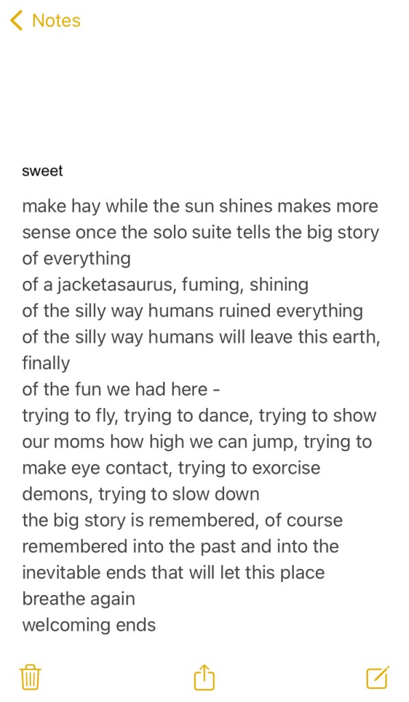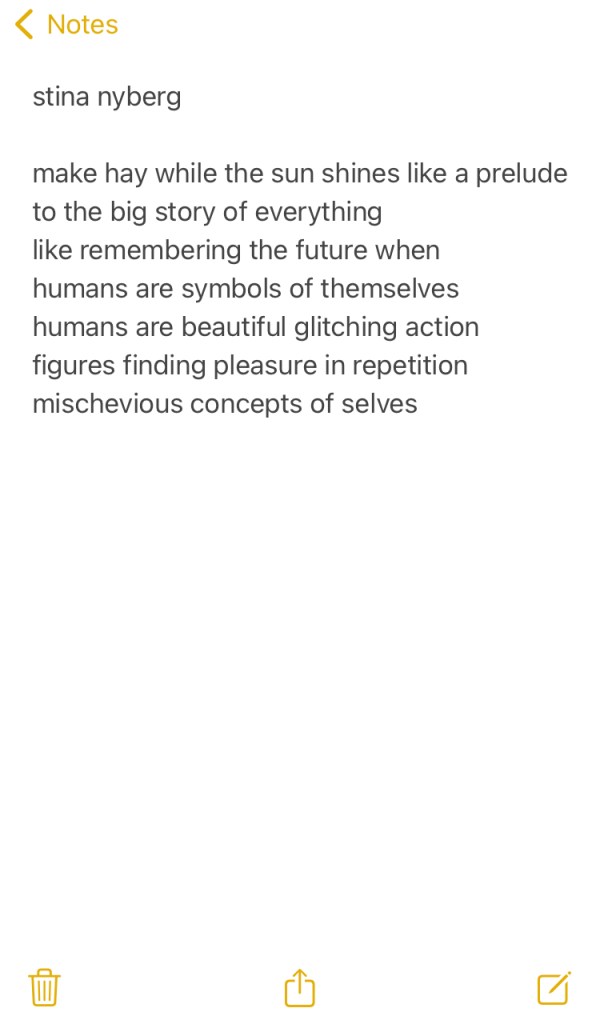 Responding (notes app edition) to Stina Nyberg’s Make Hay While the Sun Shines and Sweet at PAGEANT